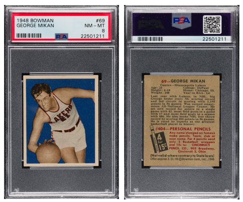 Following World War II, as Americans’ focus returned to domestic entertainment, the popularity of basketball and its cards grew. The 1948 Bowman set marked a milestone entry into the mainstream, being the first national release. It consisted of 72 cards, led by superstar George Mikan. Mikan’s card from this set in a high grade can easily achieve a six-figure payout at auction, and near complete sets can also be worthy of bidders’ attention.