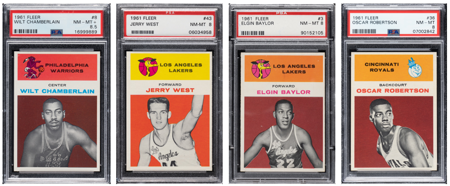 Basketball cards started with a bang in the 1960s. As formidable as the 1957-1958 Topps set was, 1961-1962 Fleer set a new standard with debuts of Wilt Chamberlain, Oscar Robertson, Elgin Baylor and Jerry West. It contained mostly player portraits, but also included action shot variations for key players. Of 66 cards, 42 featured Hall of Famers, and the set remains not only one of the most popular basketball card sets, but one of the most popular vintage sets in any sport.