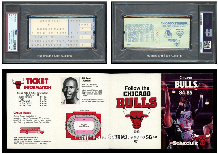 As with cards, highly-valued ticket stubs are graded and valued accordingly. In the November 2021 auction a PSA 6 stub from Michael Jordan’s 1984 debut sold for $270,600.
