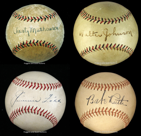 Signed baseballs are the gold standard, and over the years we’ve auctioned hundreds, including balls signed by Babe Ruth, Christy Mathewson, Ty Cobb, Ted Williams, Lou Gehrig, Ted Williams and many more. The finest examples, shown below, feature not only Hall of Fame caliber players but also signatures that remarkable in clarity relative to their age.